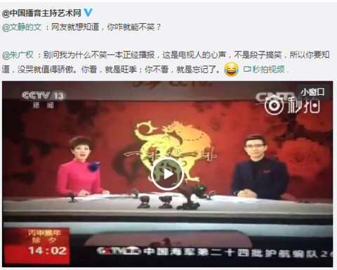 文靜都在問,你說段子咋不笑呢,而朱廣權又來了,這是電視人的心聲,不是段子搞笑,所以你要知道,沒哭就值得驕傲。嗯,真是被新聞耽誤的相聲演員。