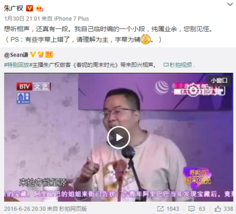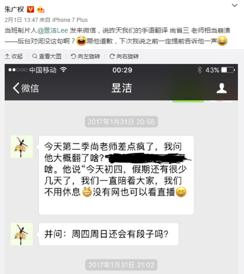 她還發微信給制片人去吐苦水,并詢問朱廣權老師,接下來的段子請提前說,這玩意兒不好表達呢。