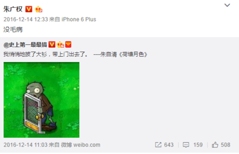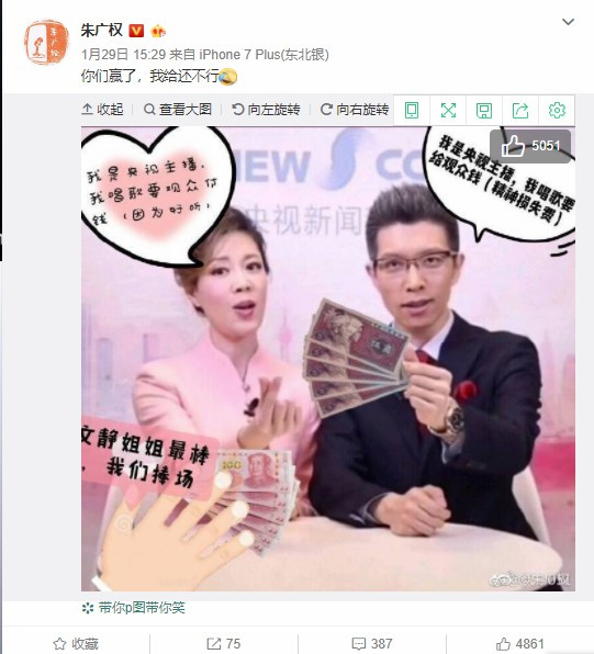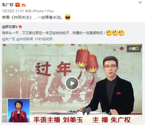 當然了,朱廣權的幽默還不止在央視新聞里面,平日里的生活,朱廣權也是一個幽默的人,緊跟熱點段子。