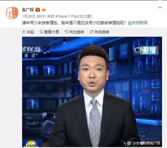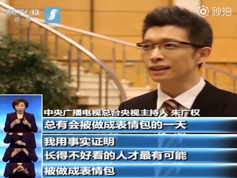 新聞馬上又轉到央視記者采訪朱廣權的畫面,小朱跟記者說長得好看的人總有會被做成表情包的一天,而自己恰恰證明了長得不好看的人才最有可能被做成表情包。