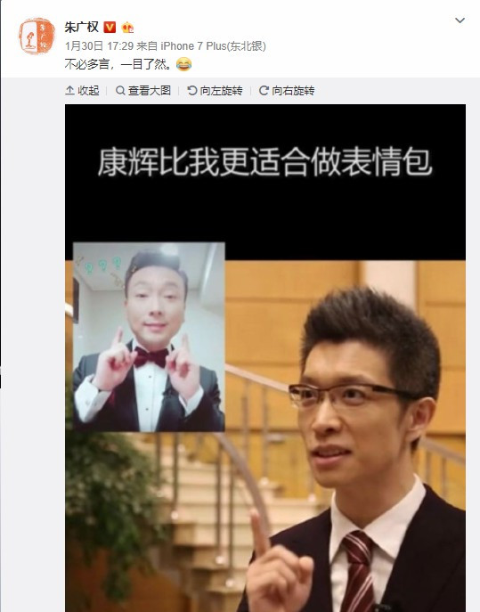 人有多大膽?且看朱廣權前幾天就在微博給大家送上了一張康輝著名的金魚嘴表情包,他讓大家在豬年可以用他做表情包(微信上真的有哦,用起來),明年鼠年,用康輝的表情包再合適不過了!