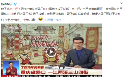 朱廣權表示,在節目里私自拱手把磁器口送給了成都,為此感到萬分抱歉,希望磁器口一江兩溪三山四街能夠原諒央媽的五虛六耗七葷八素。