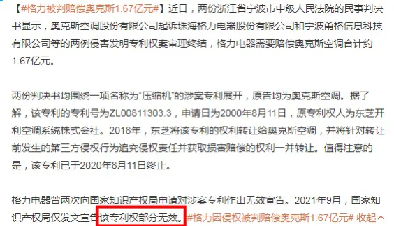 格力電器因侵害發明專利權被判賠奧克斯空調1.67億元!根據公開消息,奧克斯空調兩為原告,對一項“壓縮機”的專利向格力電器提出訴訟。奧克斯這項專利技術是2018年的時候從東芝開利空調那里受讓過來的,專利終止日期是2020年的8月11號。