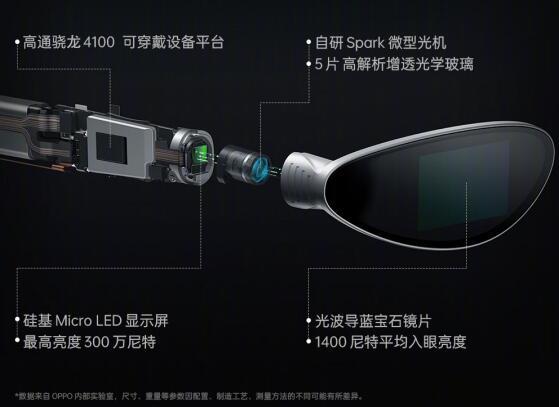 性能方面,OPPO Air Glass搭載了高通驍龍4100可穿戴設備平臺,并集成自主研發的Spark微型光機、Micro LED和定制光波導技術.其中Spark微型光機是目前業界最小的光機,體積僅約一??Х榷勾笮?在有限的體積里Spark微型光機集成了5片高透玻璃鏡片,帶來了出色的散熱性和穩定性.而Micro LED顯示技術則擁有高達300萬尼特的顯示亮度,可以做到在各種復雜光照條件下都提供清晰明亮的顯示效果,進一步提升使用體驗.