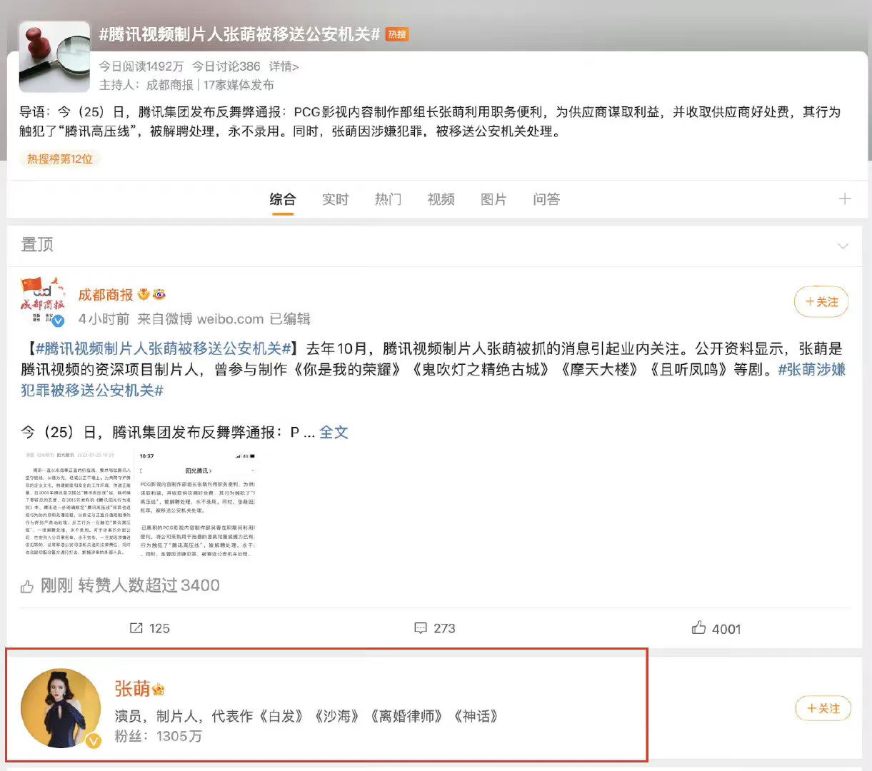 騰訊視頻制片人張萌被移送公安 存在違反公司高壓線(xiàn)行為