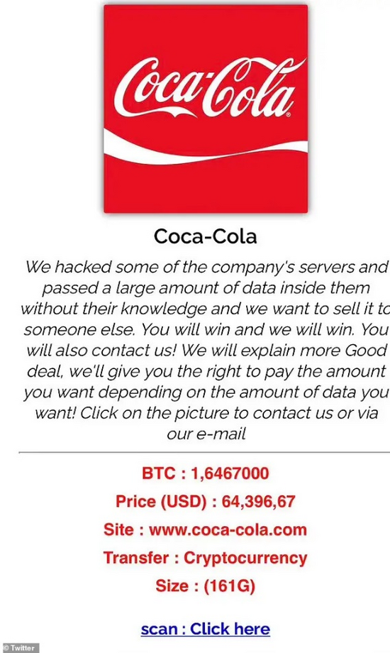 近日,俄羅斯黑客組織Stormous宣布成功入侵可口可樂,并盜取了161GB的數據,包括財務數據、密碼和商業賬戶等機密內容。目前,Stormous正在將這些數據明碼標價,任何有意的人都可以用1646.7萬個比特幣或644萬美元左右的價格購買這些數據。