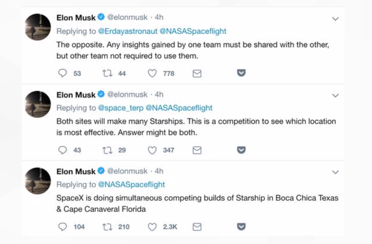 馬斯克表示,SpaceX將在德克薩斯州和佛羅里達州兩地生產許多星際飛船。“這是一場競賽,看看哪一處能夠更有效率。任何一邊所獲得的觀察洞見,將會被分享給另外一邊,但另一邊的團隊可以不使用這些觀察結論。”