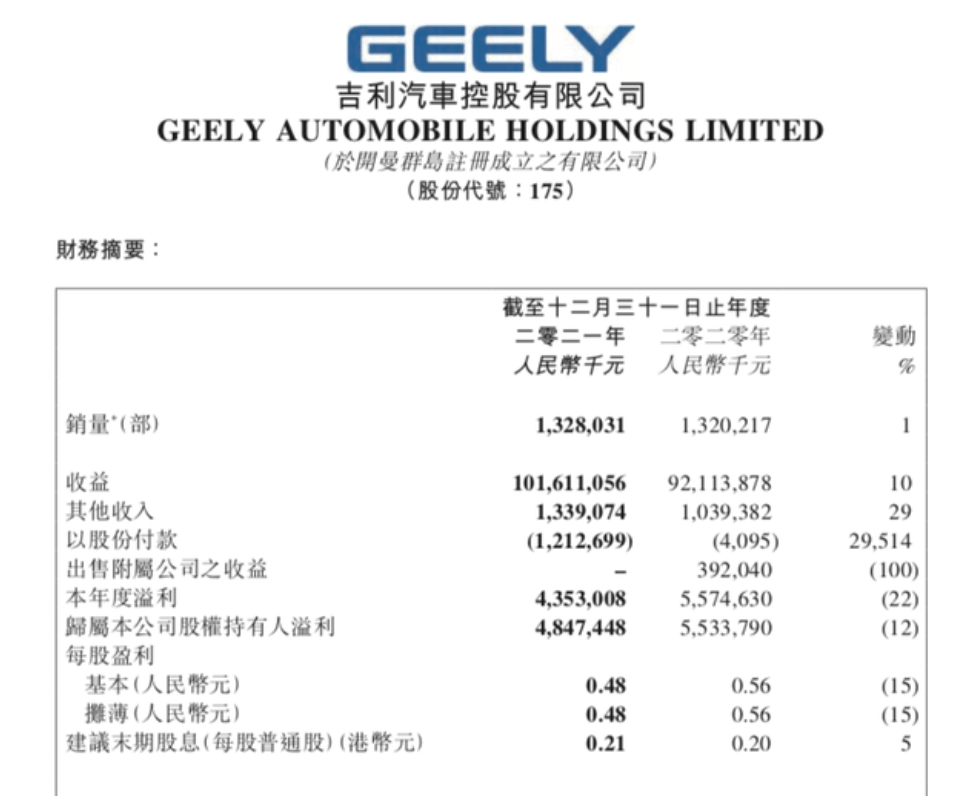 根據吉利前不久發布的財報,2021年全年,吉利實現營業收入1016.1億元,同比增長10%;剔除股份支付凈利潤達到60.6億元,同比增長9.4%。更關鍵的是,吉利的新“藍色行動”終于初見成效:全年新能源電氣化車型銷量達到100126臺,同比大漲47%。