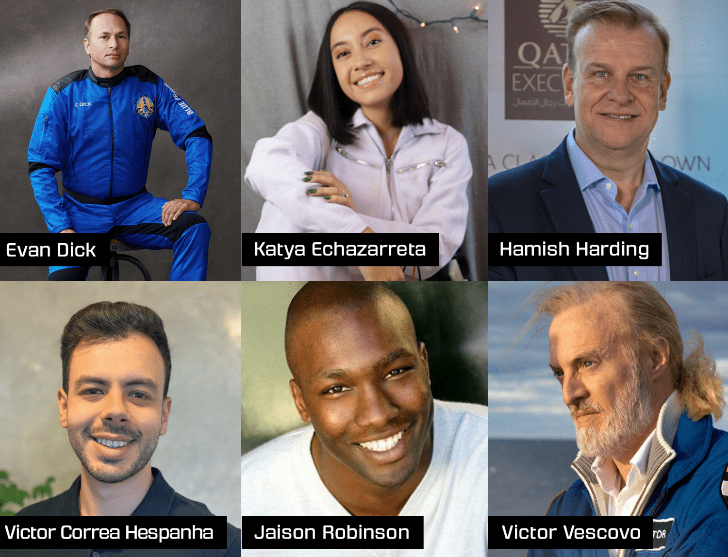 本次飛行也是新謝潑德亞軌道飛行器的第21次任務,6名乘客分別是投資人和NS-19亞軌道旅行乘客埃文·迪克(Evan Dick)、電氣工程師和NASA前測試負責人卡蒂亞·埃查扎雷塔(Katya Echazarreta)、公務機飛行員哈米什·哈丁(Hamish Harding)、28歲土建工程師維克托·科雷亞·赫斯帕尼亞(Victor Correa Hespanha)、創辦了商業地產公司的冒險家賈森·羅賓遜(Jaison Robinson)、私募股權公司聯合創始人維克托·維斯科沃(Victor Vescovo)。