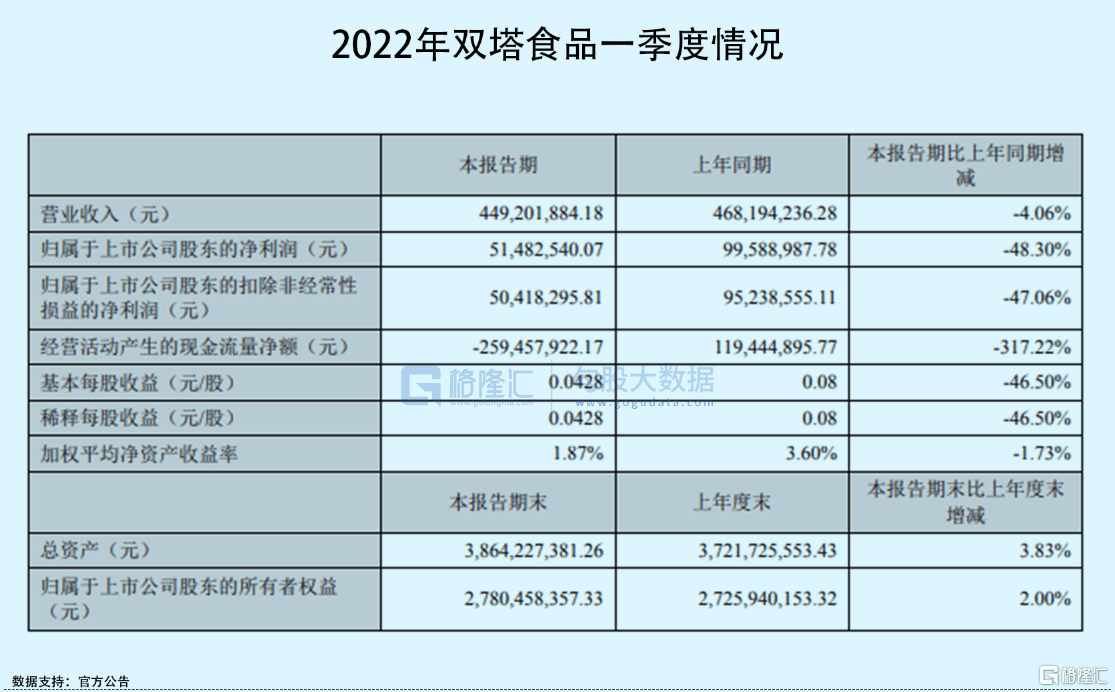 而它的合作伙伴雙塔食品也一樣,業績不算樂觀。2022年第一季度營收約4.49億元,同比減少4.06%;歸屬于上市公司股東的凈利潤約5148萬元,同比減少48.3%;基本每股收益0.0428元。