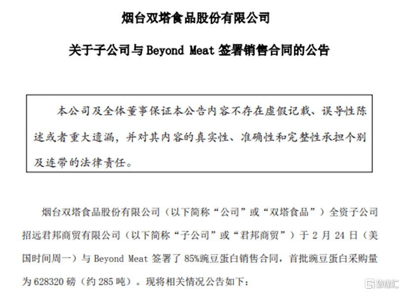 其中,2020年2月,雙塔食品宣布,通過全資子公司招遠君邦商貿有限公司與Beyond Meat簽署了85%豌豆蛋白銷售合同,首批豌豆蛋白采購量為62.83萬磅(約285噸)。此前公司在投資者互動平臺表示,公司已有植物小酥肉、植物雞塊、植物肉餅等產品。