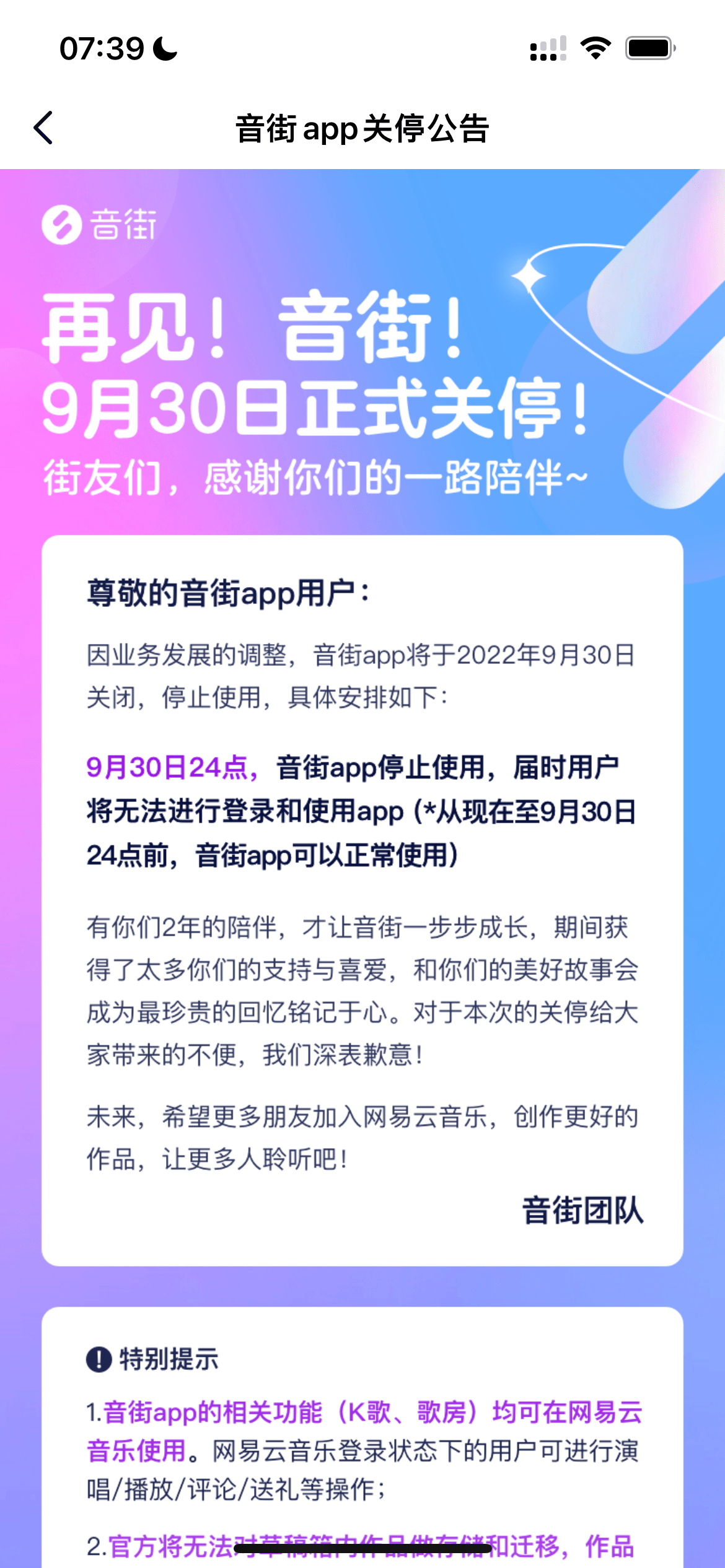 9月30日24點(diǎn),音街App停止使用,屆時(shí)用戶將無(wú)法進(jìn)行登錄和使用App(從現(xiàn)在至9月30日24點(diǎn)前,音街App可以正常使用)。