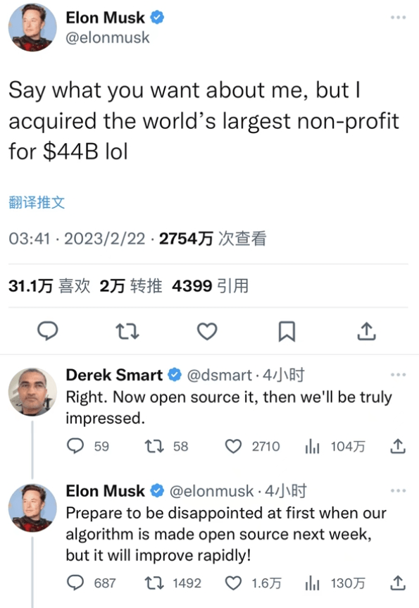 有用戶在與馬斯克互動時表示,如果推特能夠開源算法,他們將會真心折服。馬斯克回應稱:當我們下周開源算法時,一開始請做好失望的準備,但之后將會快速改善。