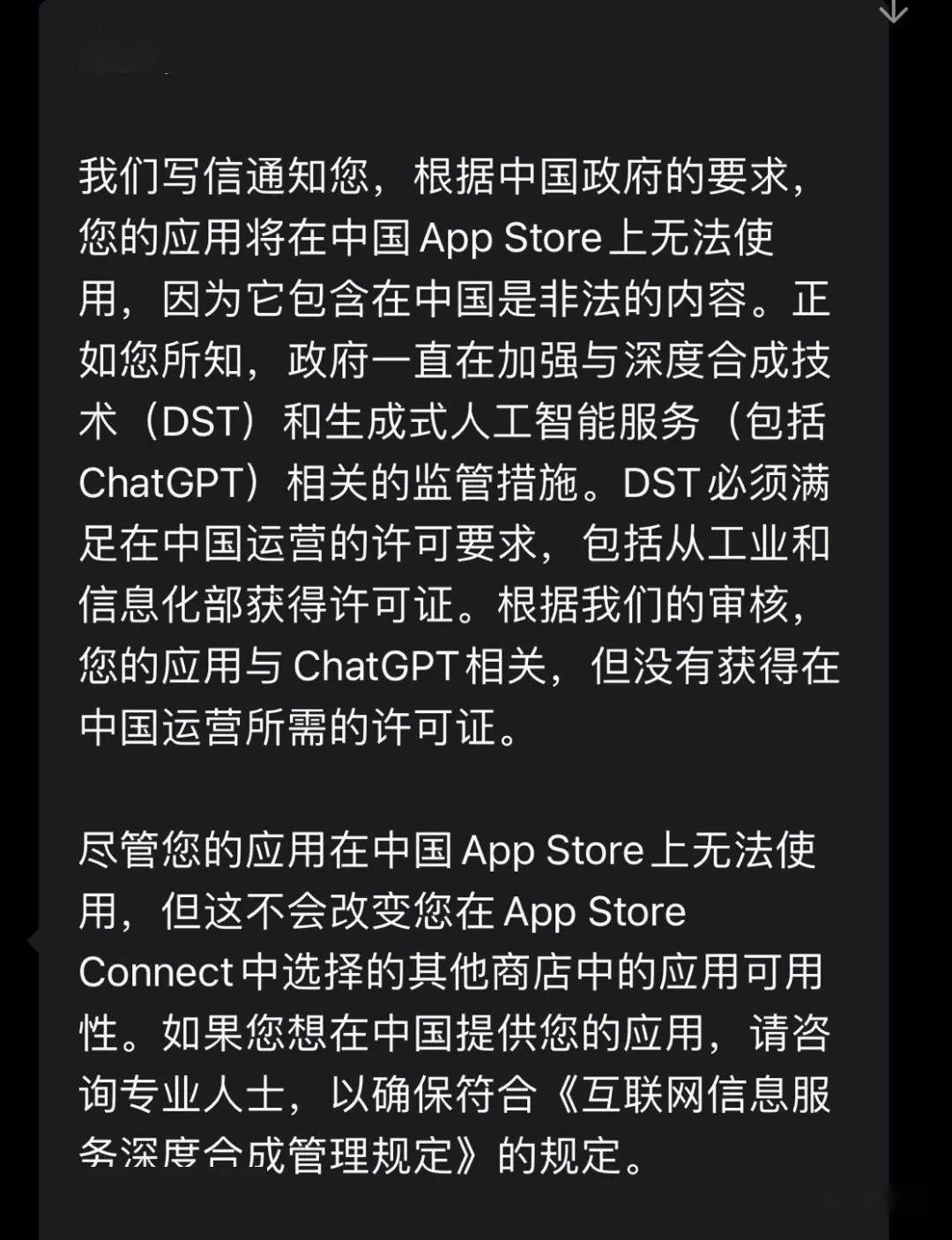 7月31日,蘋果商店宣布對中國區中大量提供ChatGPT服務的應用進行集中下架。