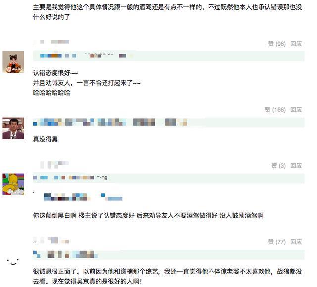 “很誠懇很正面了。以前因為他和謝楠那個綜藝,我還一直覺得他不體諒老婆不太喜歡他,戰狼都沒去看。現在覺得吳京真的是很好的人啊!”