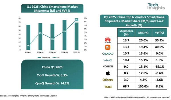 中國智能手機市場回暖,華為領(lǐng)跑Q1出貨量榜!蘋果跌至第五
