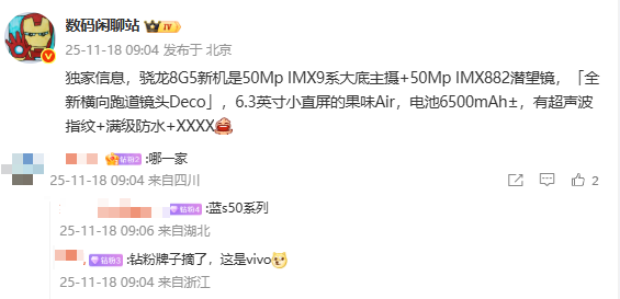 據知名數碼博主@數碼閑聊站 最新發布的信息顯示,與此前曝光的消息基本一致,全新的vivo S50 Pro Mini將后置IMX9系傳感器的5000萬像素主攝,IMX882傳感器的5000萬像素潛望式長焦鏡頭,鏡頭模組采用全新橫向跑道鏡頭Deco設計。正面則將配備一塊6.3英寸左右的直屏,電池容量為6500mAh左右,將支持超聲波指紋和滿級防水,還有一個未知的賣點。