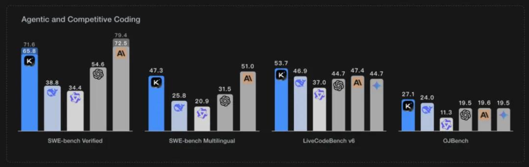 事實上,Kimi K2模型在成本上也很有優勢。11月,月之暗面發布了最新的開源巨模型Kimi K2 Thinking,其在推理、編碼能力的測試上依然保持領先。