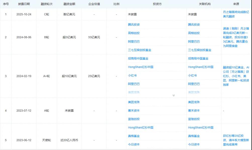 天眼查顯示,從2023年6月至今,月之暗面共計完成5輪融資,根據公開數據,目前已拿下超30億元融資,背后的投資方包括紅杉中國、今日資本、真格基金等知名機構。